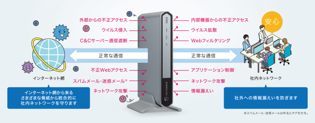 UTMとは、Unified Threat Management(統合脅威管理)の略。複数の異なるセキュリティ機能を一つのハードウェアに統合し、ウイルスなどの脅威に対抗するためネットワークを管理します。情報を守る、現代の課題の1つを弊社がサポートいたします。